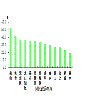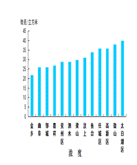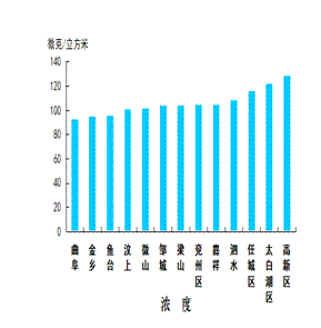 二氧化硫浓度最好的县(市、区)是金乡县,为22微克/立方米;最差的县(市、区)是太白湖区,为40微克/立方米;同比改善幅度最大的县(市、区)是嘉祥县,为53.4%,同比改善幅度最小的县(市、区)是微山县,为29.6%。