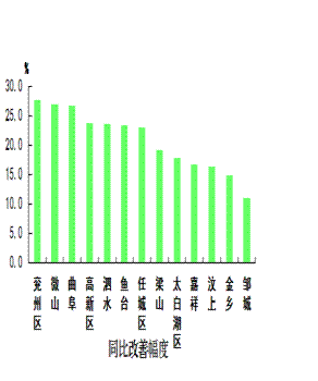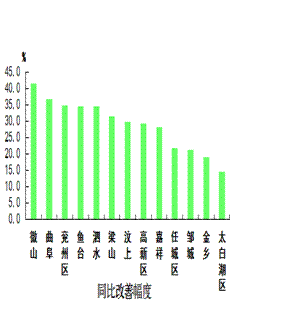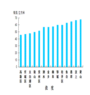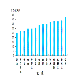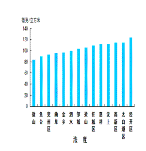 可吸入颗粒物浓度最好的县(市、区)是微山县,为84微克/立方米;最差的县(市、区)是经开区,为124微克/立方米;同比改善幅度最大的县(市、区)是微山县,为41.7%,同比改善幅度最小的县(市、区)是太白湖区,为14.8%。