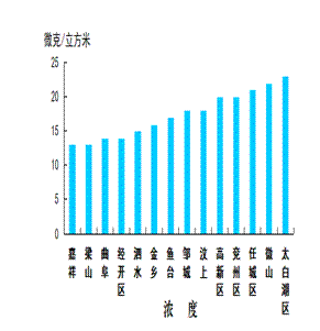 二氧化氮浓度最好的县(市、区)是经开区,为17微克/立方米;最差的县(市、区)是兖州区,为39微克/立方米;同比改善幅度最大的县(市、区)是鱼台县,为17.2%,同比恶化幅度最大的县(市、区)是太白湖区,为29.4%。