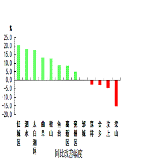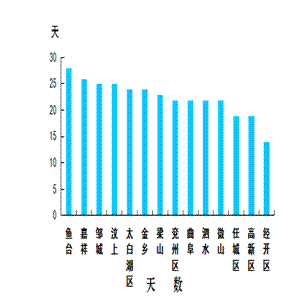 优良天最多的县(市、区)是鱼台县,为28天;最少的县(市、区)是经开区,为14天;3县(市、区)同比改善,改善幅度最大的县(市、区)是邹城市,为25.8个百分点;两县(市、区)与去年同期持平,8县(市、区)同比下降,下降幅度最大的县(市、区)是金乡县,为19.4个百分点。